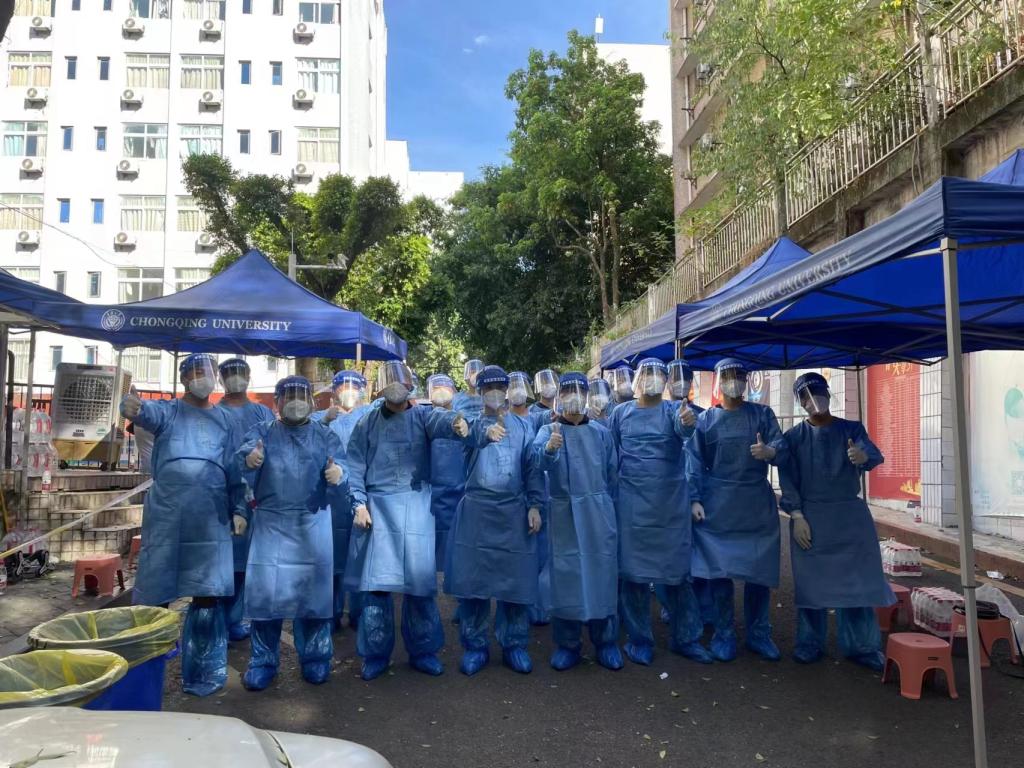 “能轮到我吗?这么伟大的事情,我不怕死,我不怕热,我是党员!!”看到教工群志愿者报名,刚来学院不久的海外归来博士后李圳程立刻踊跃报名。他和张莉从虎溪校区到C区支援,是本次志愿者风险较高,工作较为严峻的地方。他们的职责是为密接的学生运送餐食和水,每天穿着密不透风的防护服爬到8楼,一干就是几个小时,一天下来汗水浸湿的衣裳,双手在在防护手套里被汗水泡到泛白发皱。