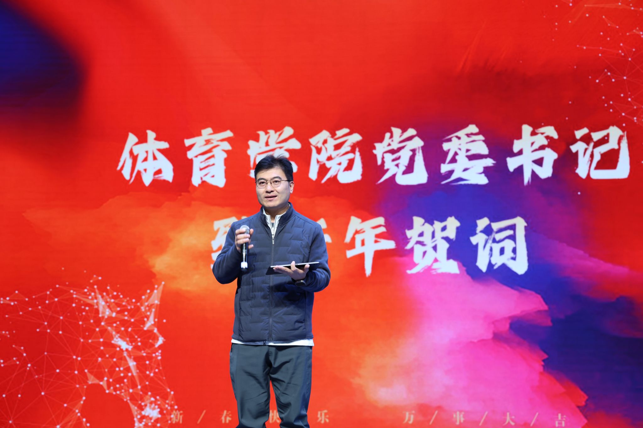 党委书记田辉登台致新年贺词。他代表学院向全体师生、来宾致以“龙马精神、万事顺遂”的新春祝福,深情回顾了2025年学院在赛事竞技、科研创新、国际化交流、队伍建设等方面取得的辉煌成就,同时寄语全体师生在2026年砥砺前行,实现学业与竞技并进,助力学院再创佳绩,字里行间满含奋进力量与殷切期许。
